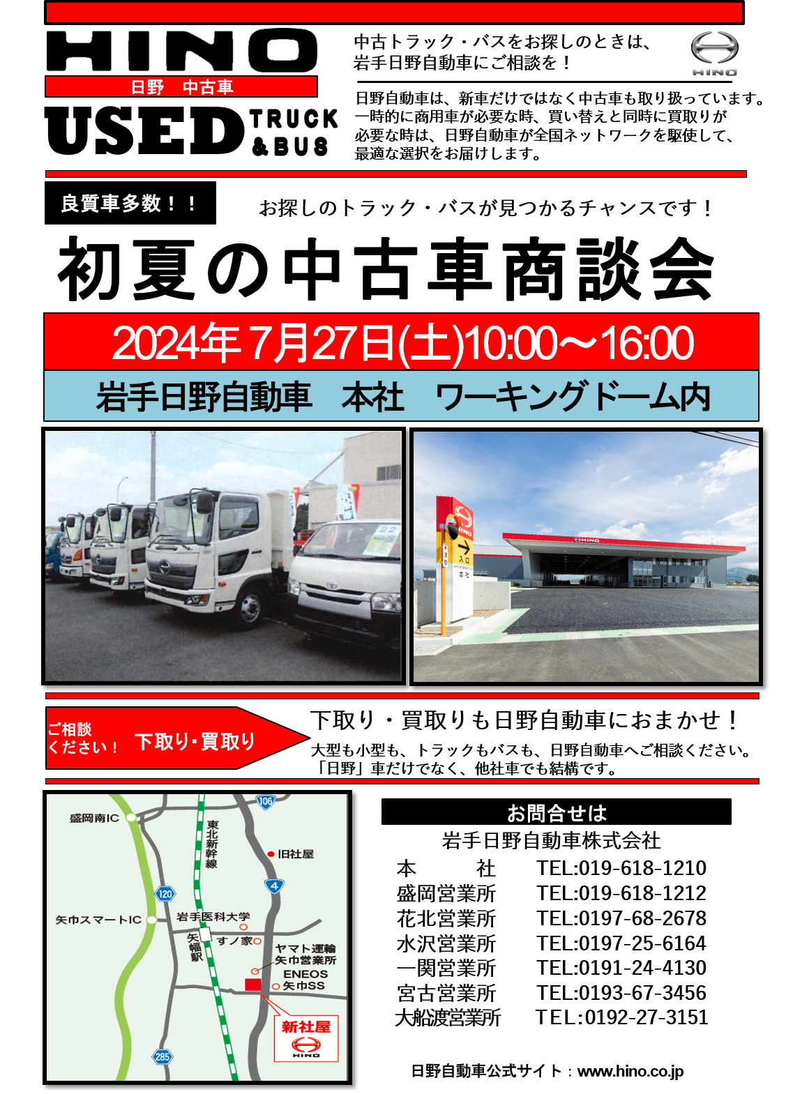 2024/8/8夏季休業のお知らせ 2024/7/31花壇自動車大学校様のオープンキャンパスで日野自動車の出展を行いました。 2024/6/267月27日「初夏の中古車商談会」開催のお知らせ 2024/6/23日野自動車 東北支部 野球大会 2日目 2024/6/22日野自動車 東北支部 野球大会 1日目