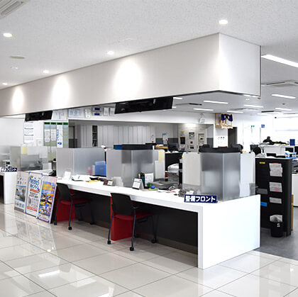 本社部門は、業務部、中古車部が2部門は社屋1階に、部品整備部、大手法人部、総務部の3部門は社屋2階にございます。