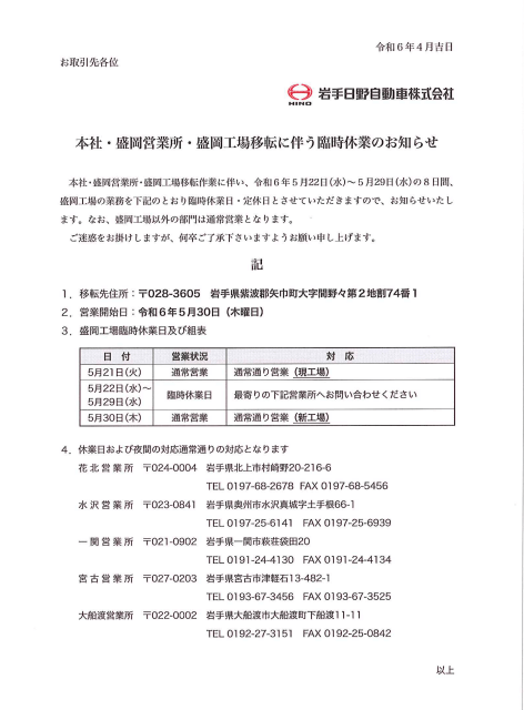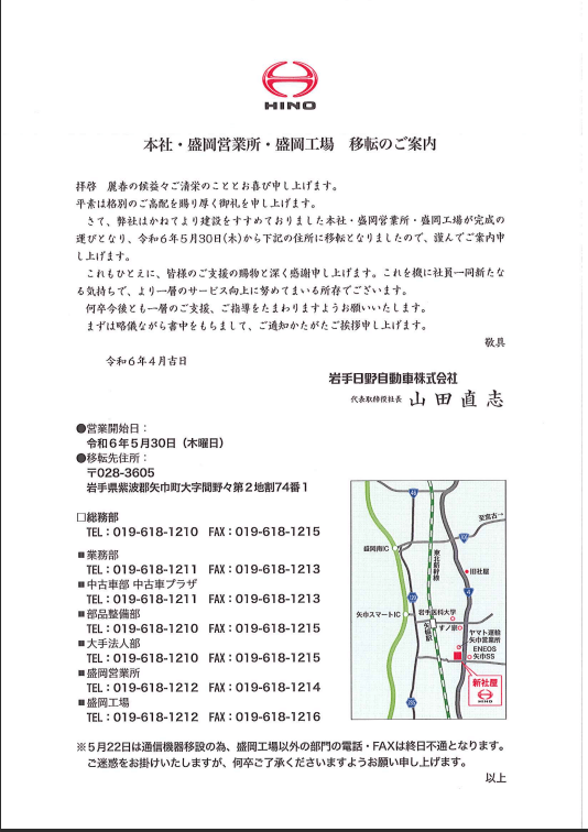 平素は、岩手日野自動車株式会社をご愛顧を賜りまして、誠にありがとうございます。